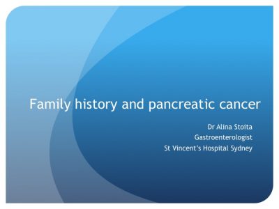 Dr Alina Stoita, a gastroenterologist from St Vincent’s Hospital Sydney, provided an update on the high risk pancreatic cancer screening trial, which has been active for nearly 5 years. She explained associated risks for familial pancreatic cancer and inherited cancer syndromes and highlighted important lifestyle strategies for at-risk individuals to consider.